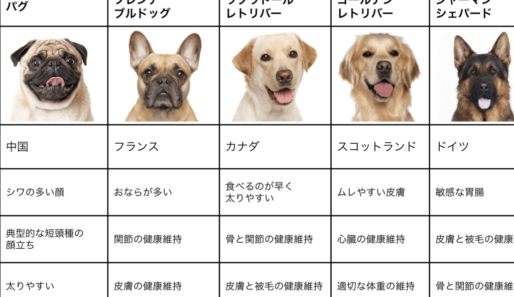 - 小型犬:飼いやすく都市生活に向いている(例:フレンチブルドッグ、パグ)