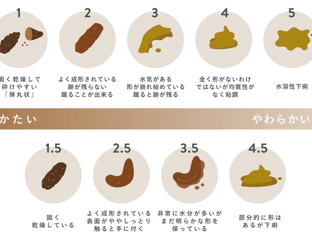 理想的な便はしっかりとした円筒形であり、大きさは個体差があります。柔らかすぎるまたは水分量が多すぎる場合(下痢)は消化不良やストレスなどから来ることがあります。一方で硬すぎる便(便秘)は水分不足や運動不足に起因することもあります。
