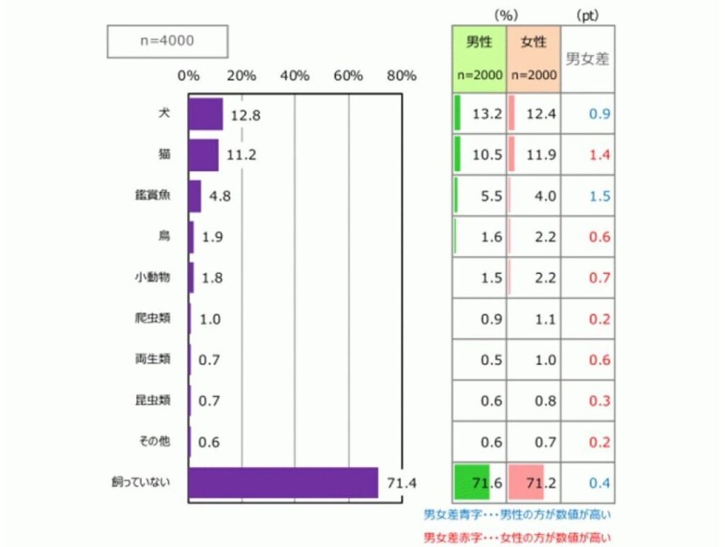 このデータから、猫が若干多く飼われていることがわかります。また、近年では小型犬や高齢者向けのペットとして選ばれることも増えており、その傾向は今後も続くと予測されています。